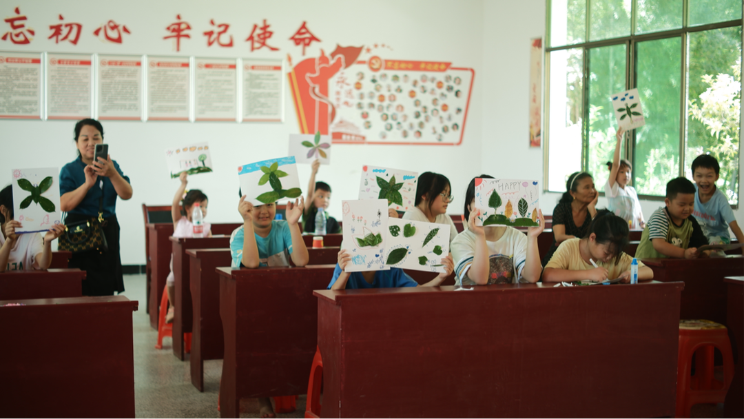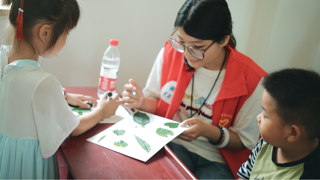 在团队成员们的指导下,孩子们认真地进行构思、拼贴、描绘,通过折、叠、剪、贴、画等手法,将一片片普通的树叶创作出不同的形式,展现出无尽的创意与乐趣。“我希望像它一样飞翔,这样就能去其他地方看看啦。”一位小朋友笑道,她用树叶和画笔勾勒出了一只在天空中自由飞翔的蜻蜓。(雷朵 徐艳 李嘉琪 侯森栋)