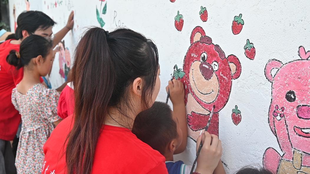 在墙绘过程中,团队成员们分组协作,默契配合,从粉刷油漆到勾形描线再到调色填色,弯腰、抬臂、起手、落笔,每一笔每一步都蕴含着对乡村的热爱和对艺术的执着。在团队成员的引导下,小朋友们也纷纷拿起画笔,让色彩在空白的墙面上缤纷呈现。团队成员与小朋友以墙为纸,以梦为墨,绘成了一幅色彩斑斓、栩栩如生的墙绘作品,展现了一幅充满创意与温情的画卷。