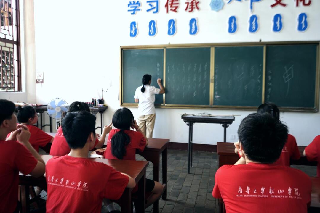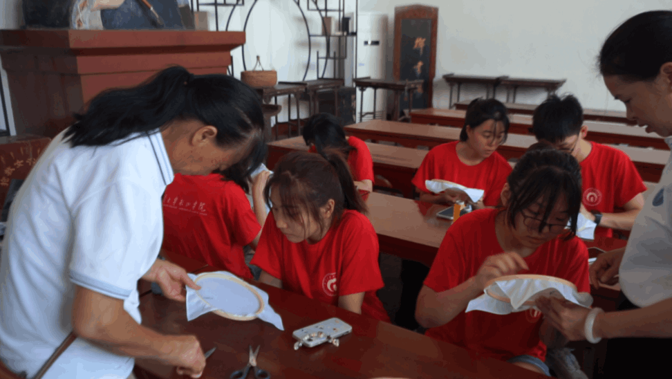 在女书传承人胡美月老师的带领下,同学们来到江永县浦尾村女书生态博物馆,胡美月老师讲述了女书的历史起源以及发展进程,接着带着团队进入女书学堂一同学习,认、识、读、写女书,同学们仔细学习。随后,在老师的带领下,同学们还体验女书刺绣。