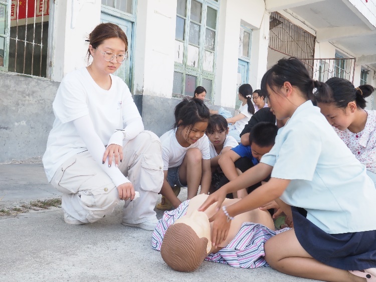 心肺复苏是急救技能中最重要的内容之一。团队成员通过模型道具的现场演示,手把手教导孩子们如何正确地进行心肺复苏,从拨打120并及时准确地描述病人情况,到胸外心脏按压、开通气道以及人工呼吸等,详细展示了心肺复苏的具体流程。在队员们的教导下,孩子们掌握了心肺复苏的基本要领,为今后可能遇到的紧急情况积累了宝贵经验。