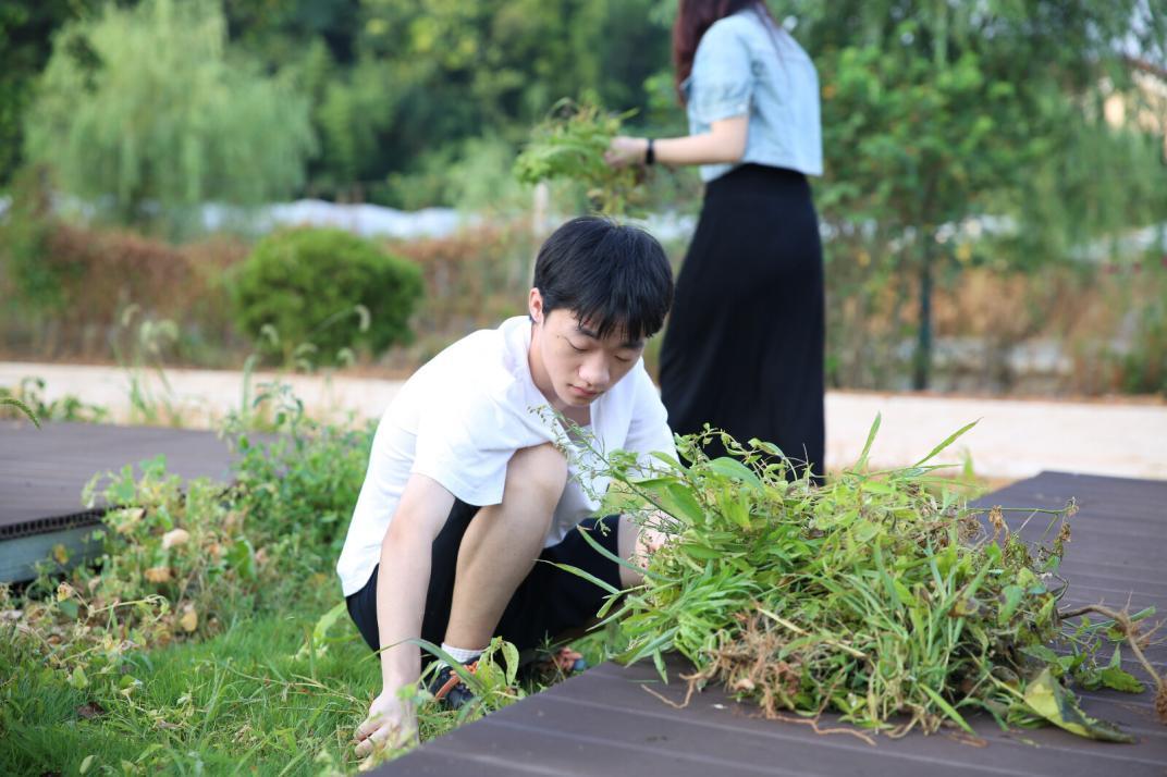 在完成清除草坪上生长的杂草、清理落叶的任务过程中,同学们分工明确,有条不紊。前排先拿镰刀收割,中排用钉耙聚拢堆好,后排负责清扫,在默契的配合中,提高了劳动的效率,磨炼了青年的意志。在完成工作之余,团队成员也帮助基地完成了草地帐篷的收纳整理、留存食品垃圾的清扫工作。同时,团队成员也学会了识别瓜苗等农作物,增长了见识。