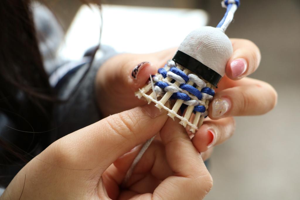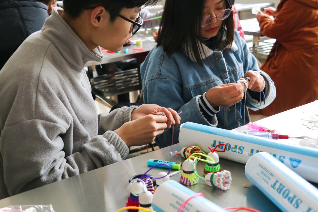 平日里球拍下飞荡自由的羽毛球在陪伴人们度过欢乐时光后,仿佛失去了其使用价值,大部分的人往往会选择将其抛弃,而在此次羽毛球挂饰活动中,破旧的羽毛球却因南华学子们的奇思妙想和心灵手巧焕发出了新的生命力。活动伊始,羽协成员细心的向大家讲解羽毛球挂饰的具体制作过程。随后,每位参与者都认真挑选了自己喜欢的各色彩绳进行搭配,并选取一个废旧羽毛球进行处理——剪掉羽毛,在球托上打孔,最后则就是进行彩线编织。在各色彩绳的装点下,羽毛球变成小娃娃、风铃等等各类形状。目光所及处,剪刀咔嚓中、打火机点燃间各色彩绳纷飞……在简单工具与灵动的指尖的配合下,废旧的羽毛球就摇身一变成羽毛球挂饰了——色彩缤纷、种类繁多。