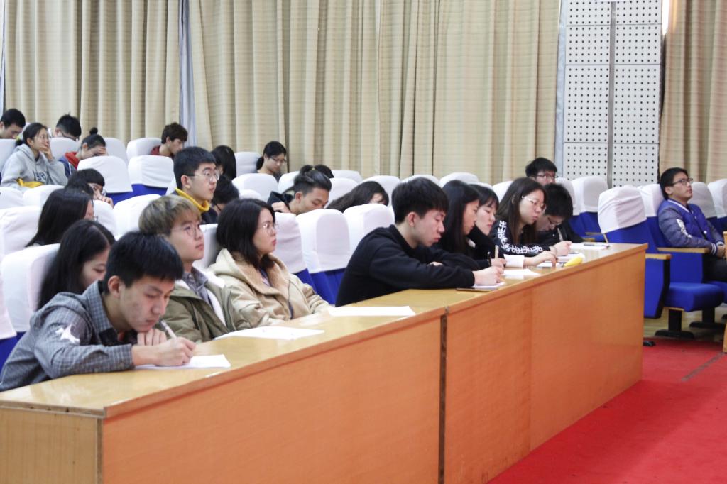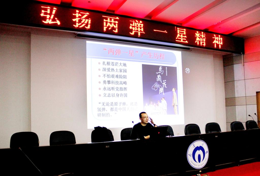 活动首先由主持人对受邀出席的嘉宾表示欢迎,随后,宋英明结合自己的职业生涯,为同学们讲述了“两弹一星”的产生历程与精神内涵。宋英明从上世纪五、六十年代中国面对严峻的国际形式,党中央果断做出研制“两弹一星”的战略决策说起,讲述了老一代科学家和广大研制人员艰苦奋斗的事迹,结合实际,让同学们更好的理解“热爱祖国、无私奉献,自力更生、艰苦奋斗,大力协同、勇于攀登”的“两弹一星”精神。