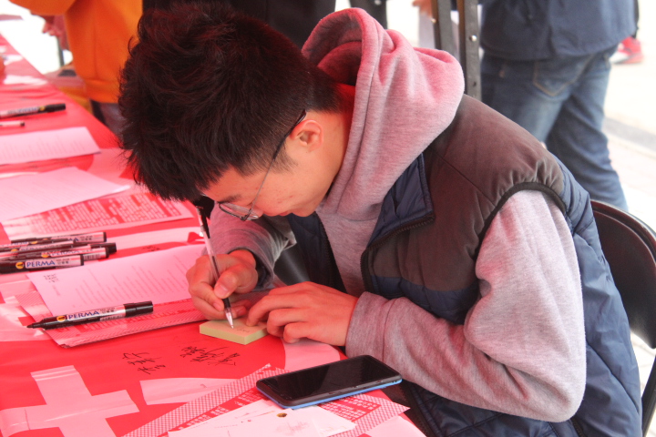 活动伊始,易班工作站吉祥物“易班熊”人偶佩戴写有“'我是艾滋病患者,你愿意给我一个拥抱吗?”的纸牌,张开双臂在路旁等待学生的拥抱。许多学生面带笑容前来,和“易班熊”热情拥抱,展现出他们对艾滋病人的理解和关爱。拥抱后,工作站成员向学生赠送代表关心的红丝带,并邀请学生进行艾滋病知识问答,通过问答形式向参与学生普及艾滋病知识、提高他们对艾滋病的认知。此外,工作站成员还为学生准备了签名横幅和留言展板,学生们可以签名留念或写下给艾滋病人的寄语来表达对他们的关爱。该活动受到了学生的热烈欢迎,过路学生纷纷前往参与,现场气氛一片火热。来自土木学院的赵婷婷说:“我觉得这是一个充满爱的活动,希望能够让更多人理解艾滋病人、关爱他们。”