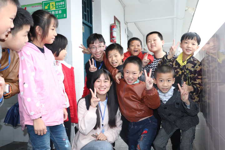 接近离别,孩子们牵着志愿者的手与志愿者合影,还有的孩子拿出了珍藏的彩纸央求志愿者为她们叠星星留作纪念。孩子们仰着头天真地问“哥哥姐姐下一次还会再来吧?”,在场的志愿者应允了他们的要求并依依不舍地进行告别。