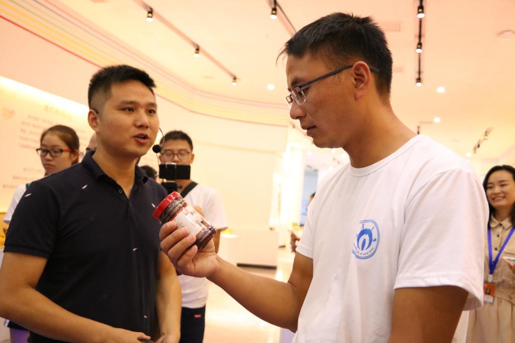 博士团一行在新化县就业服务局驻产业园代表陈波的带领下,参观了产业园“特色产品O2O展示展销中心”。陈波从品牌特色、品牌故事、发展情况、行业数据四个方面为博士团一行介绍了木雕、白溪豆腐、水酒、中药材、茶叶、特种陶瓷、新化文印等新化本土特色品牌。