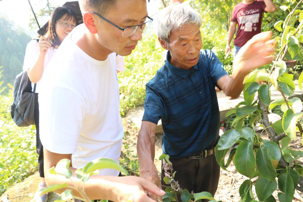 当日下午,博士生服务团成员前往村民黎德球家对其果园、田园进行实地调研与指导。“这种梨最大可以长到一斤一个!”黎德球满脸笑意的向服务团成员们介绍自己的种植成果和作物种植中使用的技术。在调研过程中,经济学博士龙会学发现该农场各种果树混杂在一起,显得杂乱无章,针对该问题并结合果园的后期规划,他提到:可以对果园进行分块划分,每一块种植一种或几种作物,使果园一年四季都有花看有果摘。在后续的调研中,黎德球提到想提高自己农作物的经济效益,龙会学根据他的想法,因地制宜的提出了“农家乐”经营模式,此外,他还特意强调:“要想把果园改造成农家乐就一定要把果园内的路修好,让游客们可以方便的到达果园的各个地方”。最后,龙会学把果园的发展与乡村发展相结合并指出:希望他可以将技术和经验分享出来,带领村民一起致富。