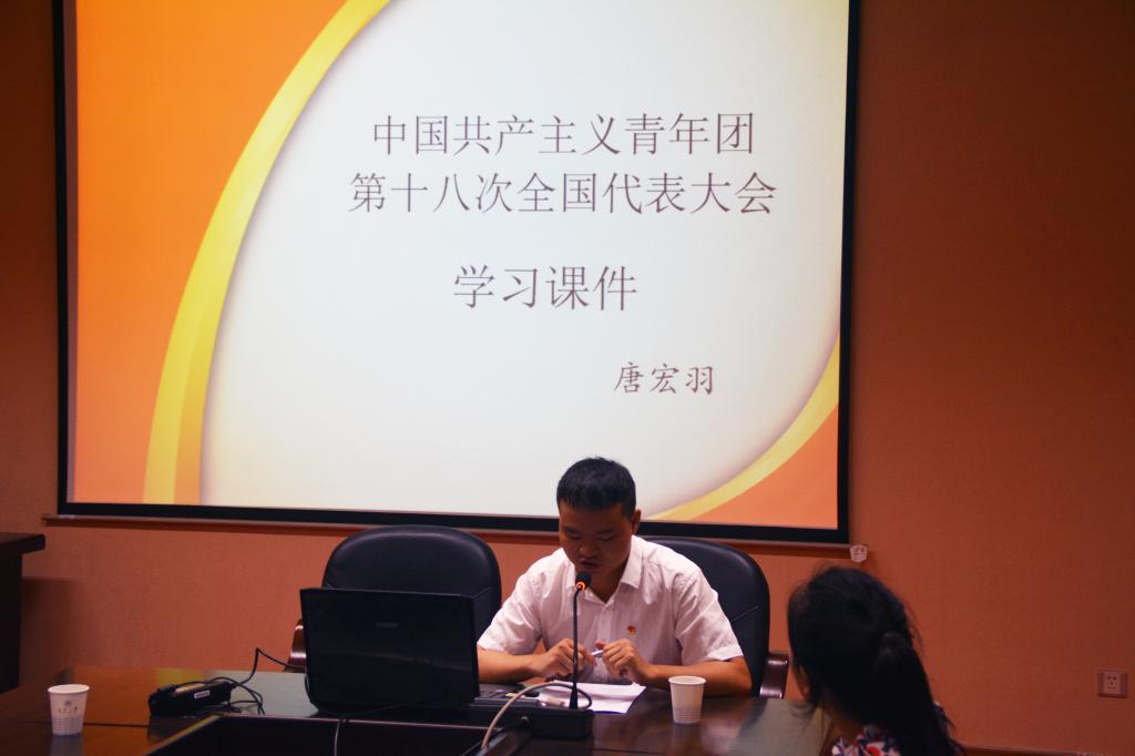 校团委副书记李海洋向参会人员传达了习近平总书记同团中央新一届领导班子成员集体谈话时重要讲话、王沪宁同志代表党中央的致词、贺军科同志代表团十七届中央委员会向大会所作的工作报告、《团章》的主要修改内容,并结合学校共青团的工作情况号召全校团员青年在团十八大精神的引导下,围绕学校党委的中心工作,按照“一基三实,一路三建”的发展思路,贡献自己的青春、智慧和力量。