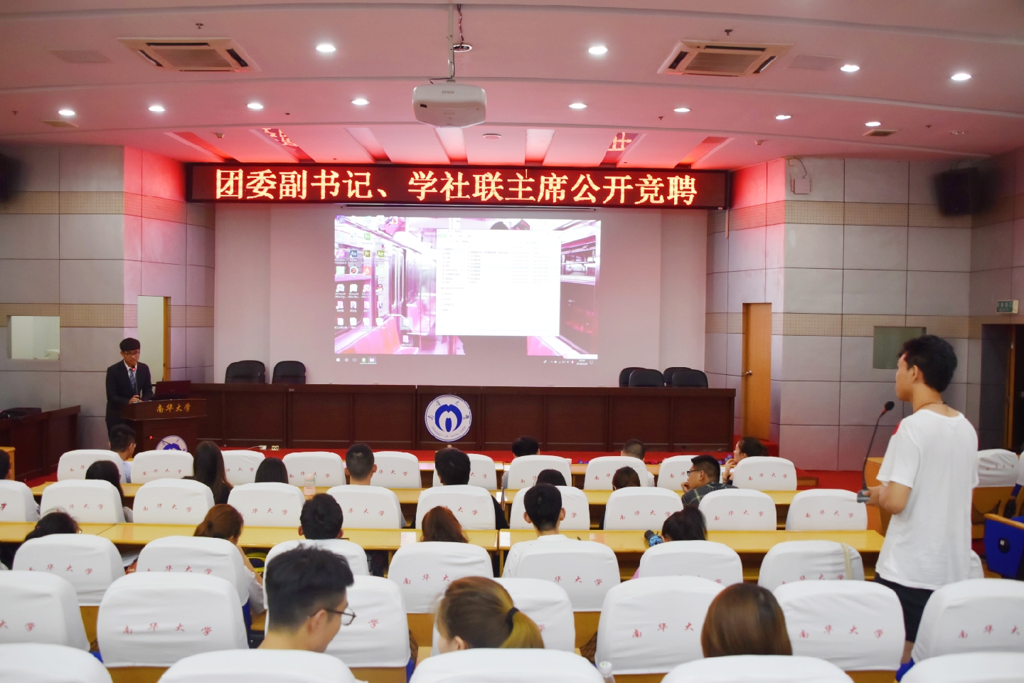 按照抽签顺序,九名竞聘者依次上台,进行了精彩的竞聘演说,其中不少竞聘者精心准备了PPT展示。他们在演讲中均回顾了学生工作历程,阐明了未来的工作思路,表达了愿为学生工作以及学校建设贡献力量的决心。评委老师及在场学生代表们也对竞聘者从“共青团的主要任务是什么”“学生社团联合会会费的管理”“管理工作如何量化考核” “如何结合南华精神担任学生干部”等多个现实问题,进行了现场提问,诸位竞聘者回答从容自信,展示了南华优秀学子的风采。“很荣幸能和各位优秀的竞选者同台,从他们的竞聘演讲中我也学习了很多,也认识到了自身还有许多不足。希望在日后的学习生活中能够更好地完善自我,优化服务。”校学生社团联合会主席竞聘人程子明如是说。