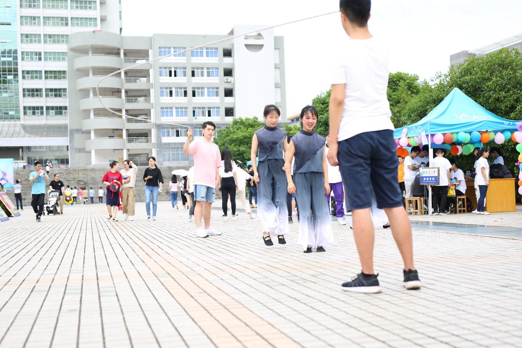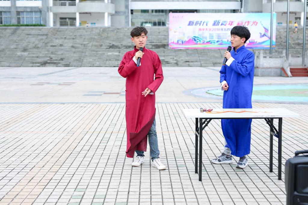 展会开始前,各学院人员便已来到南华广场进行准备工作。许多展示着大学生创新创业、志愿活动成果、国学与法文化、核文化与核精神、优秀团支部文化、宿舍文化的精美展板依旧被摆放在南华广场,向过往行人展现我校大学生丰富多彩的学习生活。其中,创新创业展板不仅以文字形式详细介绍了其创新成果,而且还展出了模型让人加深理解,如便于红枣采收的倒伞式红枣震动采收装置模型等等;国学与法文化的展板则从国学和法文化两个方面对我国先进文化进行了简要的介绍和有力的宣传。准备工作结束后,机械工程学院带来的一支街舞拉开了集体表演的序幕,一时间音乐声、欢呼声、掌声和笑声充满了整个广场。本次表演除了有常见的歌唱、舞蹈等节目外,还有一个与众不同的相声表演。来自设计与艺术学院的郭方伟和宋剑默契配合,通过在充满趣味的相声表演中插入口技、黄梅戏、京剧、快板等传统优秀技艺,体现了我国优秀传统文化的博大精深和源远流长,也展示出大学生对优秀传统文化的重视和传承。此外,集体花样跳绳和花样踢毽子等传统民俗体育、真人大富翁等趣味游戏也吸引了不少学生前往参与,青年的阳光和朝气在游戏过程中充分显现出来。
