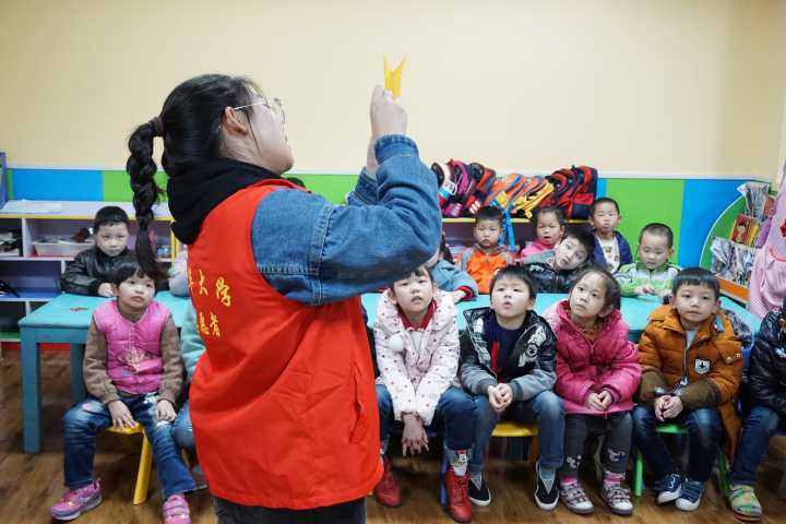 为迎接世界儿歌日的到来,志愿者们以欢快的儿歌节目《幸福拍手》拉开了本次活动的序幕。志愿者和孩子们亲密互动并鼓励他们参与表演,现场一片欢声笑语。表演结束后的“网小鱼”、“找朋友”等趣味游戏,更加拉近了志愿者与孩子们之间的距离。康复教室内,孩子们欢笑着跑动着,每一张小脸上都洋溢着快乐。此外志愿者们还手把手教孩子们做手工,通过耐心地讲解制作的方法步骤、不断鼓励着孩子们自己动手尝试的方式积极与孩子们进行沟通。孩子们在做好的折纸手表上画上了刻度和指针,有的孩子还画了花朵等简笔画,极富童趣,令在场的人回忆起了儿时的幸福时光。