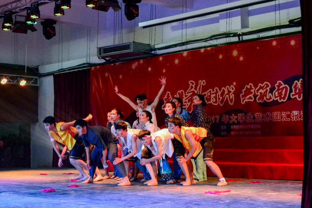 晚会在热闹的锣鼓声中拉开了帷幕,首先表演的节目是获得第五届大学生艺术展演省一等奖的作品民乐合奏《丰收锣鼓》,各式各样的乐器演奏气势磅礴,旋律跳动,情绪热烈,表达了劳动人民对土地与劳动的热爱。接下来表演的是获得校曲艺大赛一等奖的相声《我要创新》,幽默的语言、搞笑的动作获得了现场观众的阵阵掌声,创新的相声表演也给了大家不一样的创新体验。在表演进入高潮时,主持人邀请在场的嘉宾和同学起立为南京大屠杀的遇难者默哀一分钟,随后上演的群舞《琼崖岁月》追忆历史,让人们仿佛回到了革命前辈用不屈的精神,无畏的勇气演绎琼崖的峥嵘岁月。精彩纷呈的表演最后在大艺团选送的合唱节目《太行山上,幽默的喧嚣》中完美落幕。