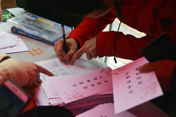 报名刚开始,现场气氛就十分火热。本次活动分为三大主题:一是“忧愁粉碎机”,二是“曾经的你,未来的我”,三是“只想对你说”。活动中学生们购买主题信封后,可以写下烦恼寄给陌生人解除忧愁;也可以写下对一个月后的自己想说的话激励未来的自己;还可以在特定的时间给特定的人的一封信,诉说情感。这三类信分别用三种不同的信封来装,每一种信封都有独特的设计,各具特色。此次活动形式十分新颖,受到了报名学生的一致好评。语言文学学院胡俐慧一次性购买了五个信封。她高兴地说:“我很喜欢这次的活动,两个信封要自己收藏,一个送给闺密,一个用来写烦恼信,一个写给一个月后的自己。”