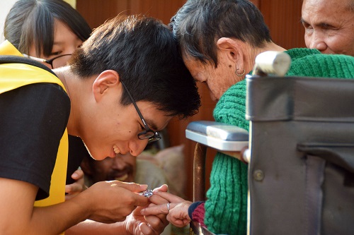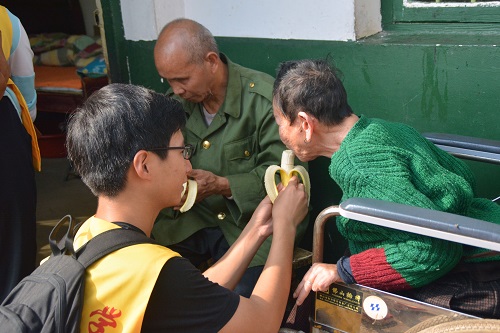 敬老院内,温暖的阳光洒在志愿者和老人家的脸上,短短几个小时,志愿者和老人们进行了亲切的互动,相处十分融洽。志愿者和老人们一起聊天,家长里短、学习课余等等,还亲自把带来的橘子、香蕉等水果喂给老人们吃,他们十分关心老人们的生活,当一位老爷爷透露出自己多年离群生活的无助,志愿者一边握着他的手轻声安慰,一边希望通过劝说为老人带来温暖。一位志愿者感叹:“如果有更多的机会,我希望能多与这些老人接触,也希望他们把我当成自己的家人。” 随后,志愿者们还为生活疏于照料的老人剪指甲,老人的脸上露出满意和蔼的笑容。