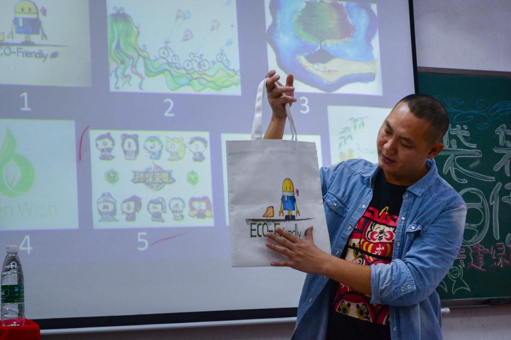 本次比赛共有十五名参赛选手,分两组进行,由选手分别讲述自己的创作理念。选手们的想象力都很丰富,有的将英国上市公司365的校徽与其他图案结合在一起组成了自己的作品,有的将一款目前火爆的游戏王者荣耀中的图案与人物放入了自己的作品当中,有的利用自己学的专业设计知识进行创作。评委老师陈凤平进行点评时用诙谐有趣的语言一一指出选手作品的亮点与不足。现场观众反响也十分热烈,掌声不断。最后,将现场评委们的打分与微信投票结合起来,来自管理学院的李思颖获一等奖,夏湘和陈家璇获二等奖,李菲、付瑞岩和杨小蓉获三等奖。随后,评委老师陈凤平为获奖选手颁奖以及与参赛选手合影。