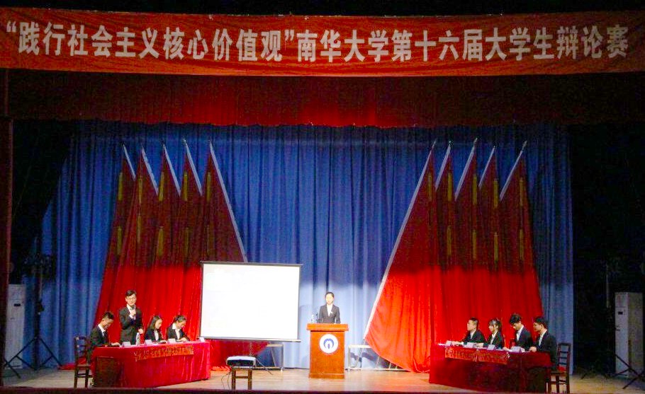 本次比赛由副校长何旭娟,校团委书记刘文君,马克思主义学院党委书记何小英,核资源工程学院党委副书记肖月生,保卫处处长龙志坚,马克思主义学院教授李晓衡,退休教师邹鲁军教授及担任评委。决赛分为两场:分别为为土木工程学院和船山学院的冠亚之争和原文法学院与电气工程学院的季殿之争。第一场比赛为文法学院和电气工程学院的季殿之争,本次赛的辩题为“用和平手段可不可以解决朝鲜半岛问题”,正方文法学院持“用和平手段可以解决朝鲜半岛问题”的观点,而反方则持“用和平手段不可以解决朝鲜半岛问题”这一观点。陈述环节正反方一辩迅速将全场温度点燃,盘问环节,双方紧紧抓住对方的陈述词的不足穷追猛打,自由辩环节更是将现场气氛推向高潮。比赛持续了近一个小时,双方辩手精神饱满,思维缜密,机智应变,激烈精彩的场景深深感染了在场每个人。比赛最后由保卫处处长龙志坚进行点评,最终由原文法学院获得本场比赛的胜利,同时获得本届辩论赛决赛的季军。第二场比赛为土木工程学院与船山学院的冠亚之争,本场比赛的双方对禁毒主要靠的是学校还是家庭展开博弈,正方土木工程学院持“禁毒主要靠的是学校”的观点,而反方则持“禁毒主要靠的是家庭”这一观点。