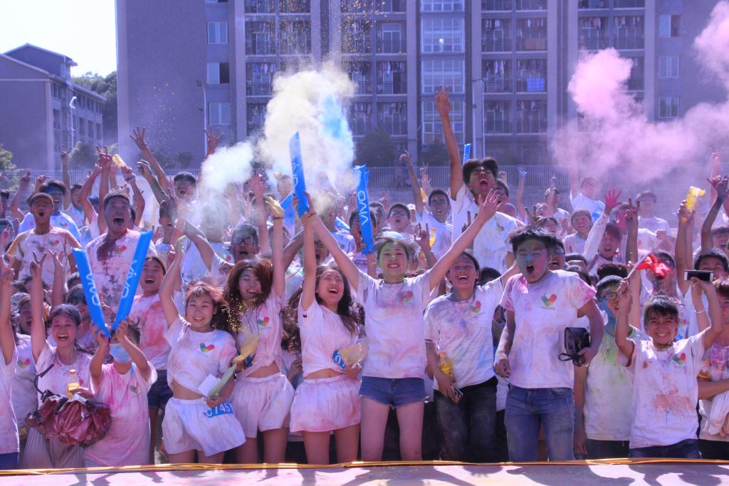 表演结束,3.4公里的“彩虹跑”正式开始。参与者从田径场起点出发,分批按照规定路线出发。“彩虹跑”全程设置三个站点,每个站点分别有热血摇滚、性感爵士、加油啦啦操等表演,活跃现场气氛,带动参与者激情。大家身着白色文化衫,奔跑的过程中,每到一个站点,大家都会相互抛洒各种颜色的玉米粉。参与者的文化衫瞬间被染成五颜六色。炎热的天气并未能阻挡参与者们的热情,欢声笑语洒满一路。最后,参与者们到达终点处进行抽奖。来自医学院的熊恩权很幸运的赢取了《快乐大本营》的门票,他兴奋的说:“第一次参加这种活动,感觉特有意义,这就叫青春。”