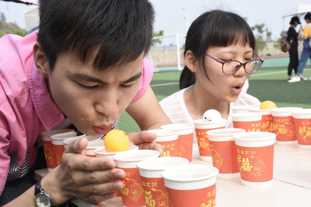 “加油!”雨母校区田径场上沸反盈天。活动中,各学院都拿出精心策划的游戏,力求使学子一扫烦忧。文法学院设计的插花环节通过亲手插花,让学子们感受到花艺之趣,更将精美成品贴在展板上展览,吸引住来往学子目光。化学化工学院的“白纸立人”游戏,要求一张白纸上站立人数多者获胜。游戏过程中,不少队伍为求获胜踩在队友脚背上,被踩者一边大叫疼痛,一边喊着继续,完全沉浸在“痛并快乐”的游戏中。药学与生命科学学院的“种草发夹”奖品吸引住众多女生的目光,成为最早被赢空的礼品。该院负责人表示:“选择花草小发卡是希望我们大学生就像这花草一般,朝气蓬勃,阳光开朗。”而船山学院的“气球大乱斗”则是男生的地盘,三人以上为一组,每人脚捆两个气球,最后气球未爆者获胜。“啪!啪!”气球炸裂声此起彼伏。其他学院更是不甘示弱,经济管理学院别出心裁的“闯七关”让不少人折戟于此;计算机科学与技术学院“七人传水”游戏考验了同窗好友的默契……