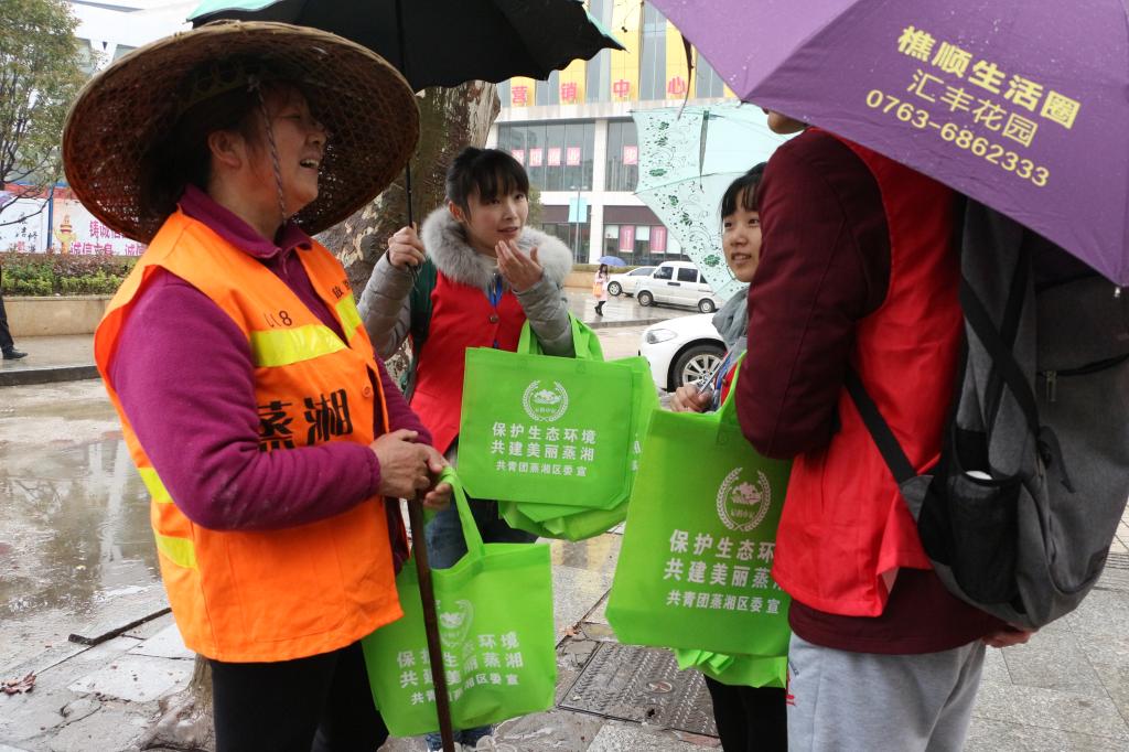 与此同时,摆点队志愿者在衡阳商业步行街进行摆点,分为两组。其中来自医学院的志愿者们热情地给来往的环卫工人和市民进行义诊,雷宏志愿者们则通过赠送环保袋的方式,对来往的市民们进行环境保护宣传,让参与活动的市民留下对环卫工人的寄语,提倡市民保护环境从身边做起,关爱环卫工人。市民何健说:“是环卫工人们才让我们的城市这么干净整洁,让我们生活的这么舒适,我们平时应该心怀感恩,多关爱他们!”