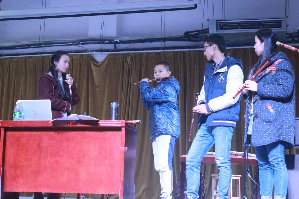 讲座包含简话笛箫、训练方法等几个方面。“笛子就是我们的亲人,我们要好好对待它们”冯燕在对学子传授乐器文化时说出了音乐人的心声。“双插笛的原理是什么?笛子有多少流派?”冯燕在讲述的时候还幽默的说,“我也和你们都一样都是百度出来的。”惹得在场听众一阵大笑,现场气氛在风趣的讲述中逐渐走向高潮。讲座中程,她还邀请学生登台演奏,就着同学的表演冯燕强调吹奏时的姿态问题,“吹奏一定要昂首挺胸,因为每一首乐曲都是你的骄傲。”最后,冯燕邀请自己的同事兼好友一同演奏,优美动听的音乐恰似游龙绕梁,引得台下观众掌声雷动,称赞连连。