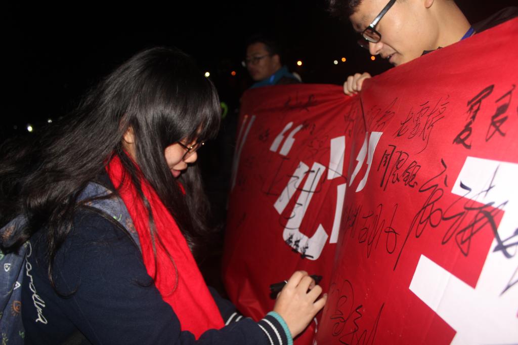 活动伊始,不断地有同学来到新食堂门口,在便利贴上写下他们的感恩之词,在横幅上签上名字。人头攒动,写满感恩话语的便利贴很快遍布整个感恩墙,横幅上也写满了签名。“当初的任性决定让我远离父母来到这里,如今回想起,却是满满的思念和对父母多年养育的感激”;“感谢这个世界对我的每一次回应……”那些说不出的感激话语,在此刻哪怕只有只言片语,都是感动。