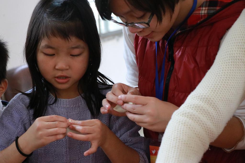 梓木食堂内,晨光爱心志愿者队队员们为梓木小学一二年级的学生讲解了饺子的来历和相关故事,耐心地教他们包饺子,从和面粉、擀面皮、剁肉馅到包元宝、入蒸锅,大家都十分投入,期间有说有笑,现场气氛火热。在大家的共同努力下,上千个“爱心饺子”成型了。二年级的陈一豪津津有味地吃着饺子,他说:“哥哥姐姐们教我们包了元宝饺子,饺子热乎乎的,很好吃,希望哥哥姐姐们常常来。”