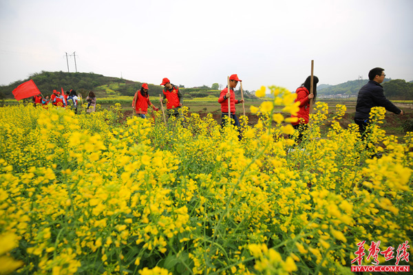 100余人分别扛起了铁楸和锄头,有条不紊地铲土、填土、浇水。尽管天气微凉,道路泥泞,鞋子上沾满了泥巴,但大家依旧干的热火朝天。微风送来阵阵花香,忙碌的同时亦可观赏美景,令人赏心悦目。