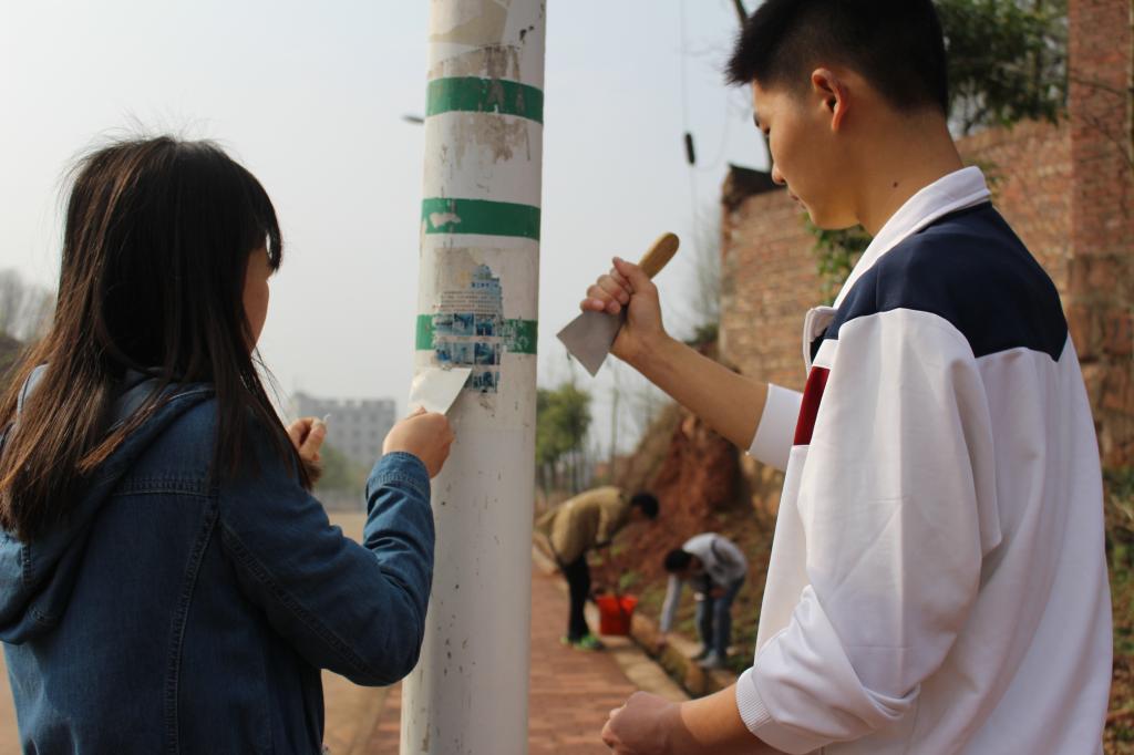在该校老食堂的公告栏和附近、宽敞的林荫大道、校园的柱子等地都有志愿者们勤劳、无私奉献的身影。他们有的认真细心的清除校园每一处的牛皮癣;有的主动帮老爷爷打扫、倒垃圾;还有的清扫路上的枯叶、垃圾·········