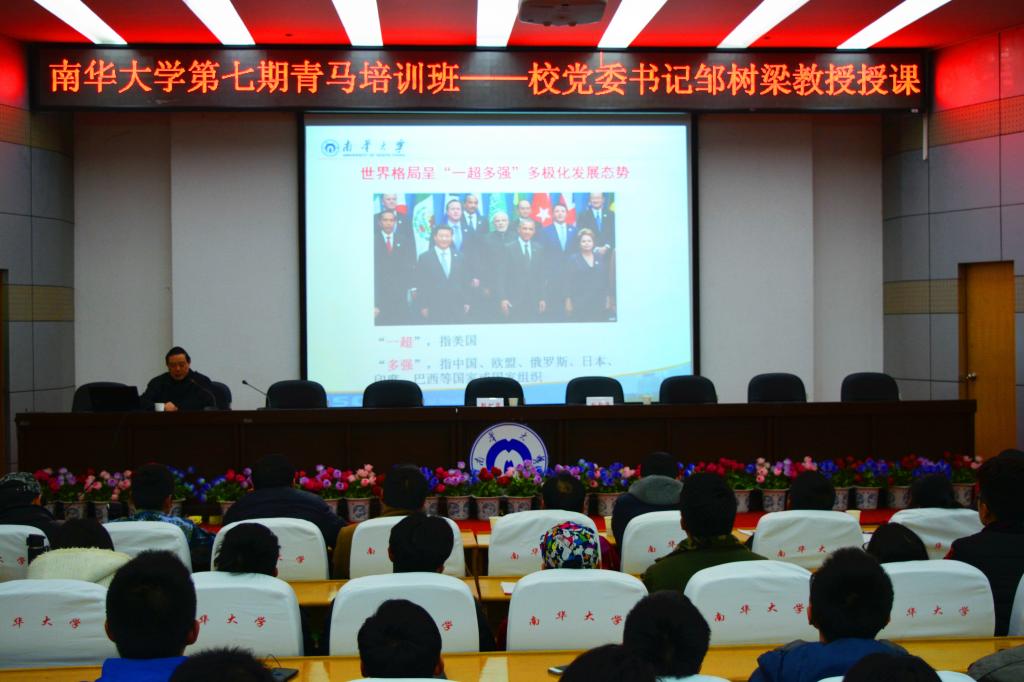 首先,由党委书记邹树梁教授进行了授课,邹书记的授课深入简出,精彩异常。他就世界局势,世界格局的新变化和世界及中国面临的安全问题做出了详尽的讲解。在讲解世界格局的新变化时,邹书记强调现在国与国之间的联系互相加深,属于“一荣俱荣,一损俱损”的国际大环境。并且针对当前国际形式对我国的影响进行了深刻剖析,指出我国现在正面临着前所未有的安全威胁——钓鱼岛主权之争、东海大陆架划分之争等。同时,邹书记也强调了现中国国力增强,在国际的话语权日益增高,而青年马克思主义者便是中国的后备力量。他教导当代青年学生要牢记历史使命,记住“青年兴则国兴,青年强则国强”,要立足于自己的专业,做一个坚定的爱国主义者,要有坚定的理想信念,练就一身过硬的本领。