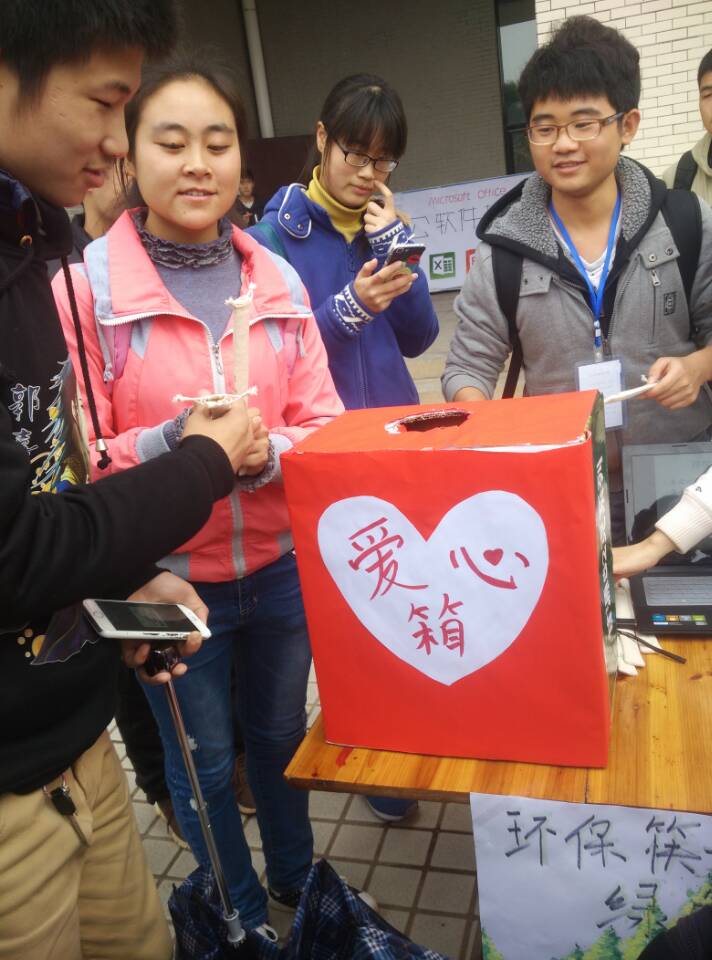 不大的摆点前面围满了好奇参观的同学,工作人员的声音从层层人群中传出来:“我们是青志先锋队的志愿者,今天的环保筷子大家都可以免费领取。但是请大家承诺,在未来三个月之内,请拒绝使用一次性筷子!”领取了筷子之后,同学们纷纷在宣传横幅上签字承诺在三个月内拒绝使用一次性筷子。活动现场引人注目的还有一个“爱心箱”,据了解,活动中筷子的领取方式采取了新颖的“半赠送,半义卖”形式。同学们免费领取到筷子的同时,也可以向爱心箱内投入善款,相当于义买筷子。不少同学选择了义买筷子,一些没有随身携带现金的同学表示会在活动第二天时前来捐款。领取了环保筷子的李家琳同学说:“这种活动很有意义,一方面宣传了环保意识,让更多人拒绝使用一次性筷子,保护树木,另一方面也以这种独特的方式筹集善款,给需要的人以帮助。”