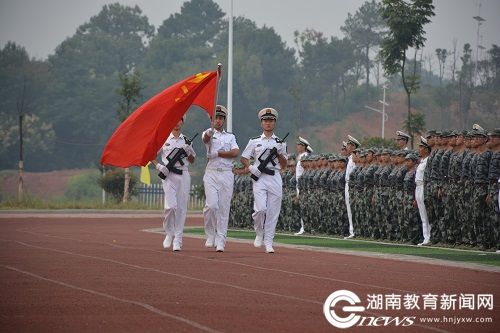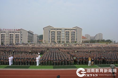 当日,在《中国人民解放军进行曲》的乐曲中,首先由国防生大队护送“牢记九一八,复兴我中华”的旗帜入场,来自各学院连队的教官率先垂范带来一段威武整齐的分列式表演,而后带领各自连队新生们高喊口号“牢记九一八,复兴我中华”有序地走过主席台接受检阅,新生们步调铿锵,口号响亮,昂首阔步,英姿飒爽,展现出当代大学生的精神面貌。阅兵过后,7000余名师生一起高唱国歌,声音宏亮,场面壮观,呈现出一道亮丽的风景。