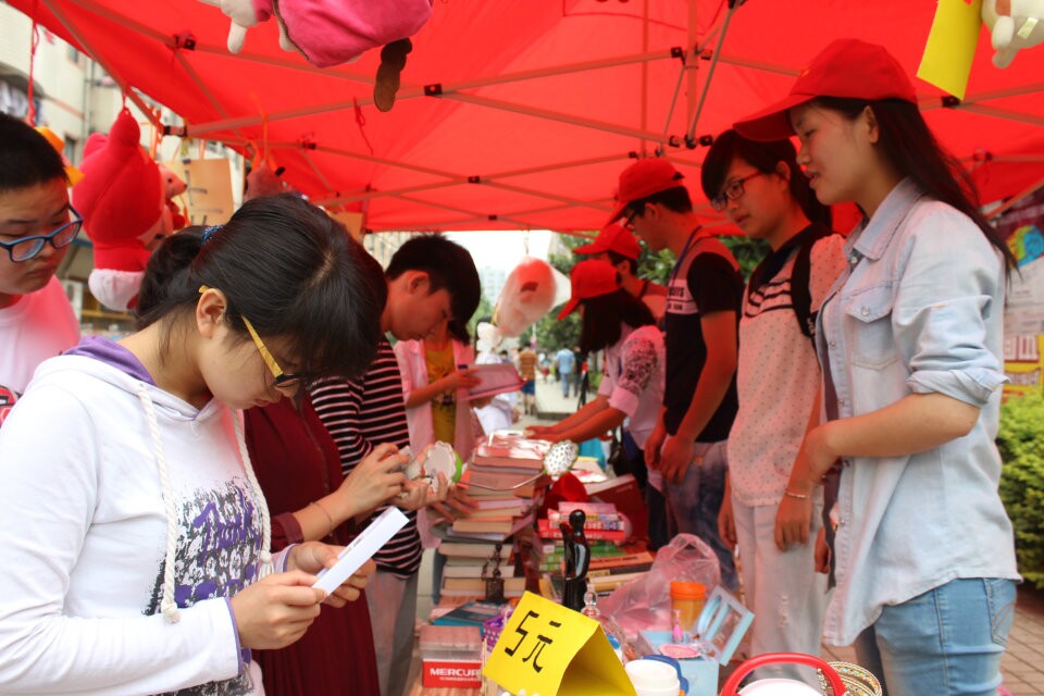 “我们每卖出5块钱,就离给贫困小学建图书馆又进了一步,去年我们的义卖活动可是为二塘小学建了一个图书室呢!”志愿者李伟说道。
