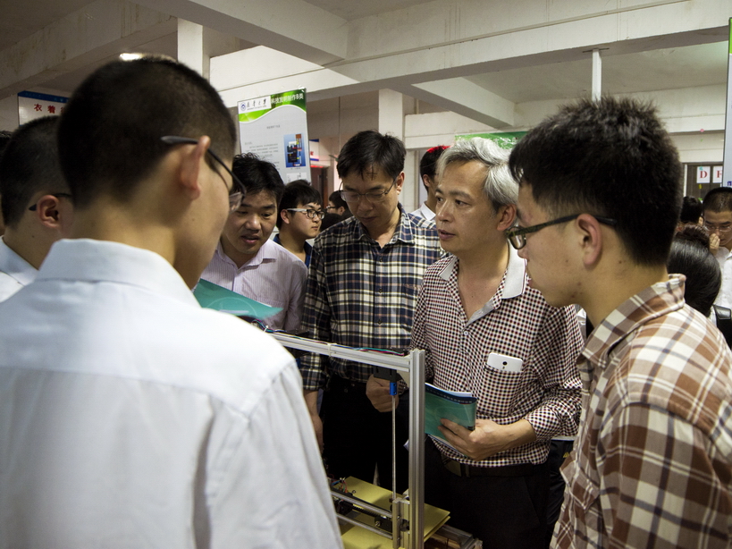 本次比赛分为专家评审与现场评价两个环节。专家评审环节由九名特邀专家在图书馆二楼会议室共同评审纸质档作品,了解相关参赛作品的创意价值、设计理念和应用价值。在了解相关信息后,各专家再到学校的行知学堂,对参赛作品进行现场评价。