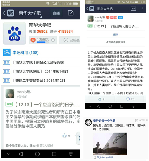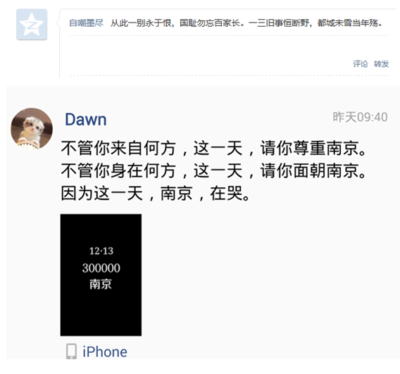 “国耻凝,血泪史。难民血,铸忠魂!警钟长鸣,勿忘国耻”;“可以原谅,但不可以忘却,三十万孤魂徘徊在南京上空”;“战火潇潇,烽烟滚滚,百年国殇,永世难忘”;“国家兴亡,我的责任。吾辈当自强!忘记历史,就意味着背叛”……一句句心言,道出南华学子心中哀悼,网友自嘲墨尽一首“从此一别永于恨,国耻勿忘百家长。一三旧事恒断野,都城未雪当年殇”更是道出了众多网友的心声。