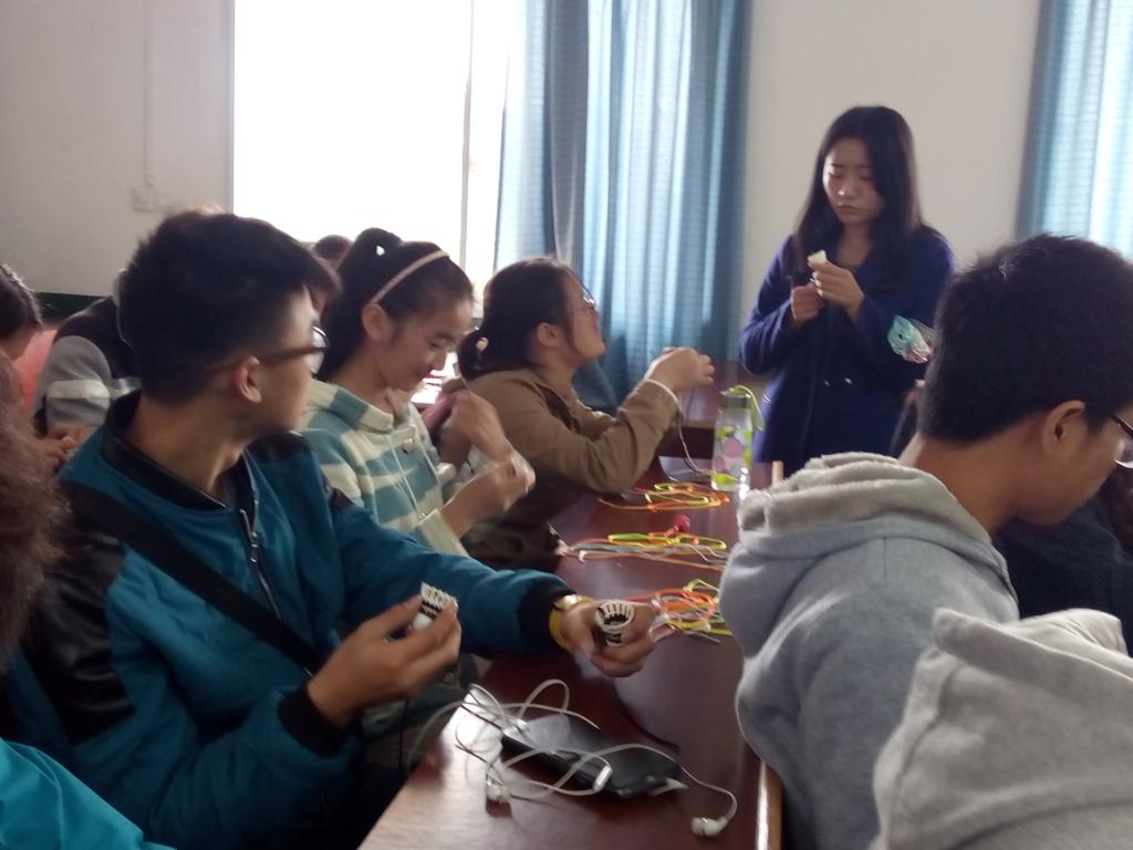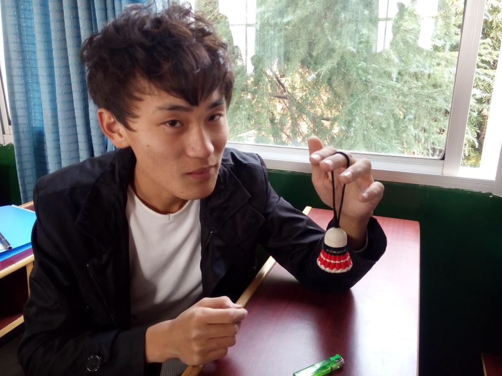 “一个小小的羽毛球挂件看似简单,其实动起手来却很难,它考验的是人的耐心、细心。”本次教员万俊佳如是说。只见他熟练地将废弃羽毛球的羽毛剪掉,只留羽毛球的球托,用红、黑两根彩线将球托的柄缠起来只留下羽毛球头。接着,他巧妙地用T针从羽毛球头里穿过球头,将穿出的T针用尖头钳子弯个圈,挂上一根彩绳,一款自制的羽毛球挂饰就完成了。他告诉我们,“缠线”是其中一个极需细致认真的过程,制作一个羽毛球挂饰新手需要花费两个多小时的时间。