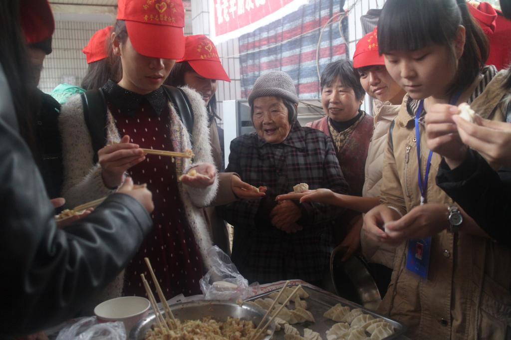 (青年志愿者与老人们一起包饺子)