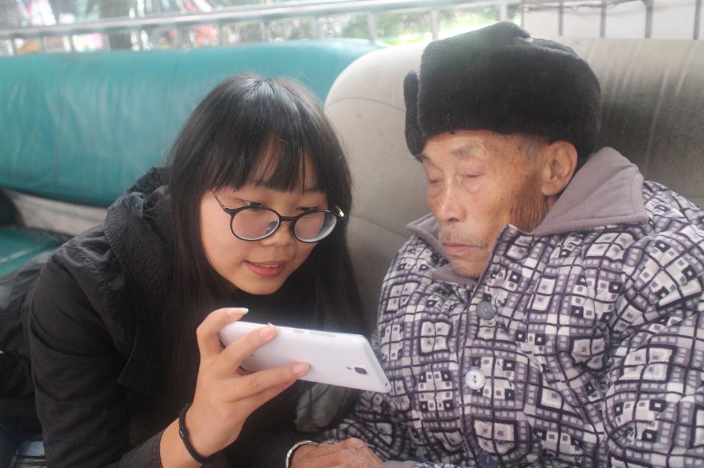 (青年志愿者向老人分享合拍的照片)