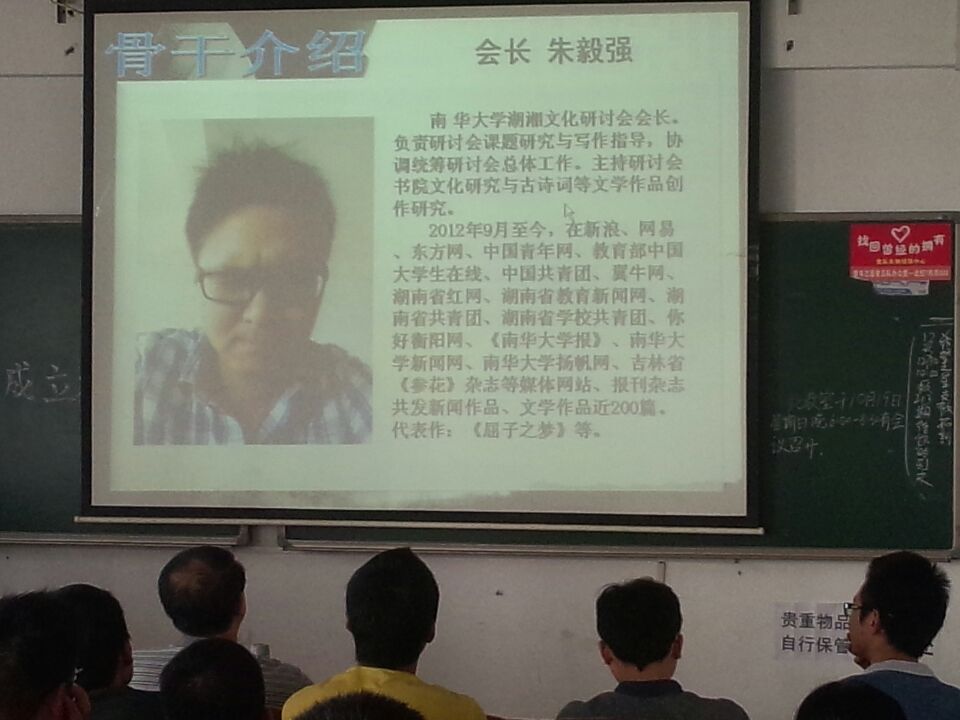 会议共分为两项,第一项首先由指导老师全华凌教授表达了对湖湘文化研讨会成立的祝贺,同时对研讨会成员做出了几点要求与希望。他告诫大家在对湖湘文化的研究上要勿忘初心,不要急于求成,只要紧紧把握住方向用心耕耘就会有成果。随后新、老生代表各自做出了发言,会长朱毅强对他们的发言进行了补充与总结,并对研讨会理事会成员及他们各自的分工进行了介绍。接着会议进行了第二项,全体会员在会长朱毅强的带领下观看学习了关于湖湘“茶文化”的两部视频,体悟茶道与文化间的关连交织。