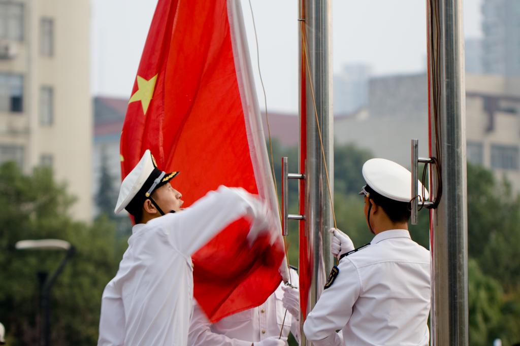 仪式开始,白色军装的国旗班,踏着整齐划一的步伐,在激扬的国歌中将鲜红国旗冉冉升起。现场庄严肃穆,全体师生行注目礼。