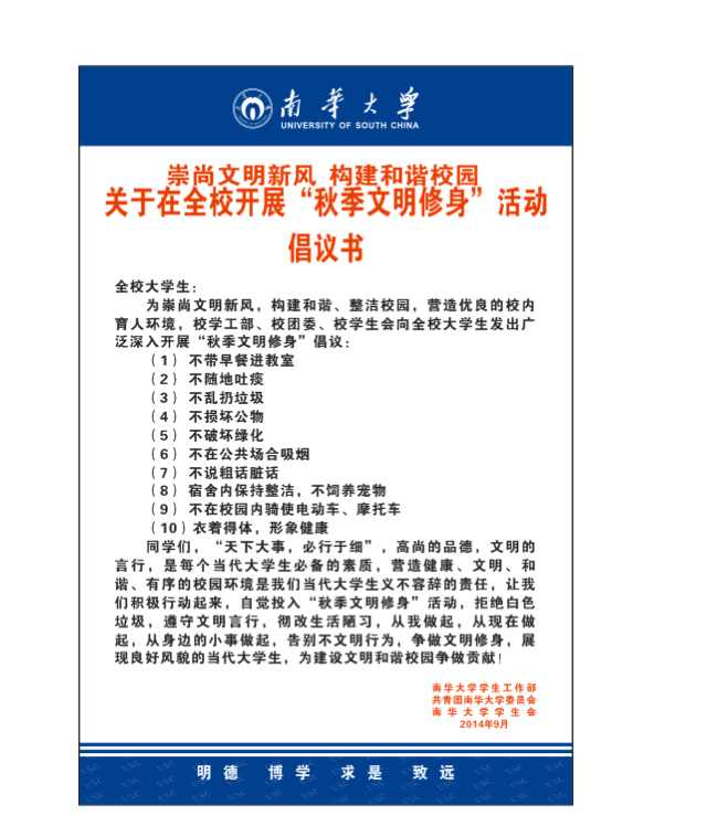 为崇尚文明新风,构建和谐、整洁校园,营造优良的校内育人环境,校学工部、校团委、校学生会向全校大学生发出广泛深入开展“秋季文明修身”倡议: