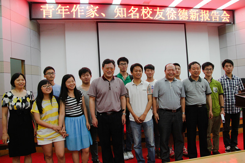 为提高大学生的文化素养,青年作家、知名校友徐德新报告会于2014年6月3日在图书馆报告厅成功举行。参加报告厅的人员有党政办、校友办、宣传部、团委、图书馆等部门负责人;文法学院、城市建设学院的党委副书记、辅导员及学生代表;大学生记者团、大学生卧虎山文学社的全体成员。