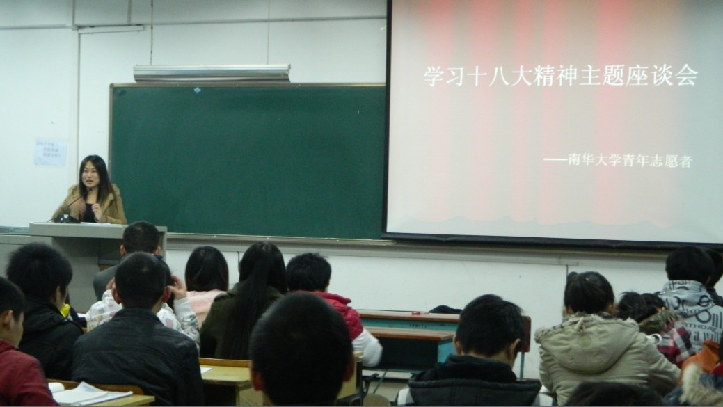 12月15日晚,1教605教室座无虚席。一场以“学习十八大精神”为主题的座谈会正式开始。本次座谈会旨在学习和贯彻党的十八大精神,广泛开展志愿服务活动,促进社会和谐发展。青年志愿者总队队长刁珂珂主持了此次座谈会。