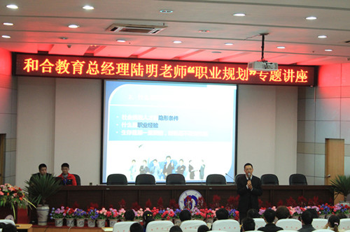 主讲陆明老师是资深教育专家、职业规划家,曾在扬州晚报等知名报刊发表了大量关于职业规划的文章。讲座的氛围非常活跃,会场座无虚席。首先,老师在讲座中提出在人才竞争激烈的今天,高学历并不等于好工作,并通过两位高材生的案例为大家讲解了规划好自己职业的重要性。随后,陆明老师详细地为同学们讲解了职业竞争力对于求职者和工作者的重要性。接着老师通过霍兰德测试了现场的部分同学,分析了其职业倾向,并向他们推荐了未来较为合适的工作。最后刘萌芽副院长向陆明老师颁发聘书,诚聘陆明老师为我校KAB创业俱乐部的指导老师。在同学们热烈的掌声中,讲座落下帷幕。