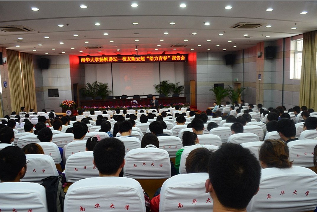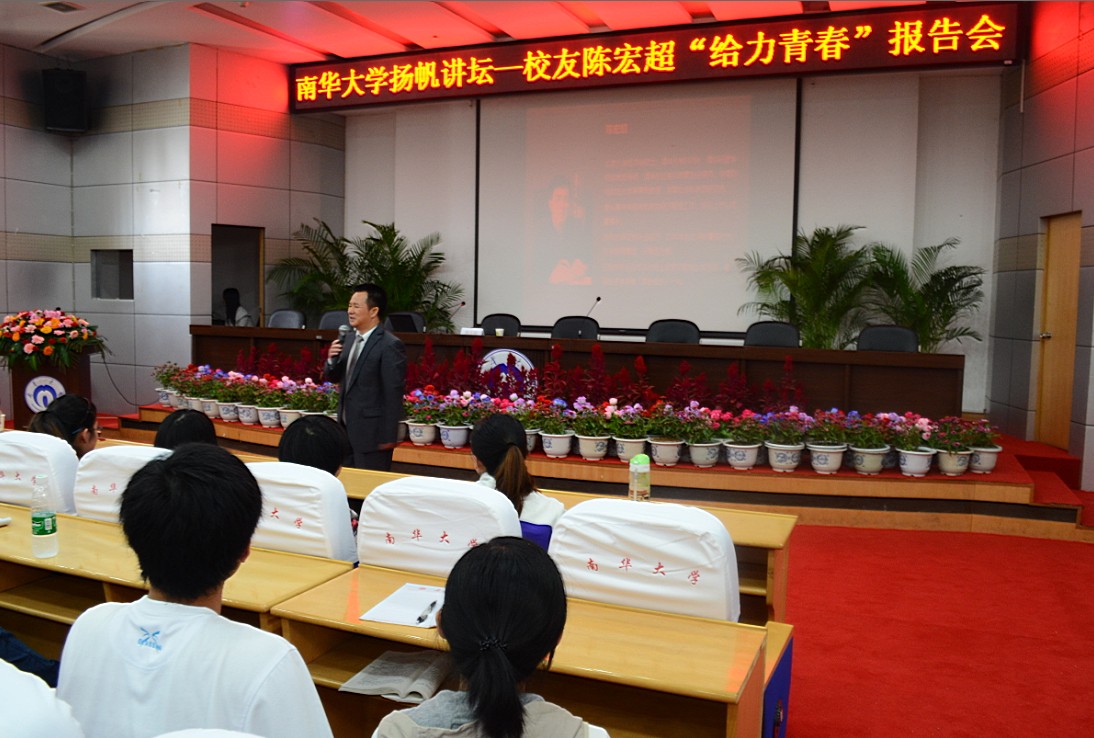 11月3日,英国上市公司365团委组织举办了“英国上市公司365扬帆讲——校友陈宏超‘给力青春’报告会”,邀请到英国上市公司365优秀校友、菁英时代投资管理集团董事长、北京大学经济学硕士,清华大学EMBA陈宏超校友为南华学子作了一场“给力青春”扬帆讲坛报告会。莅临本次报告会的嘉宾有:西华大学管理学院党委书记芮光正、校团委书记谢四平、学校经管学院副院长、MBA院院长刘春教授、经管学院党委副书记廖迎春等,各学院学生代表听取了报告。报告会由校团委副书记谢铷鸿主持。