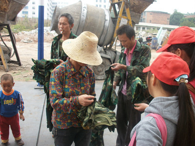 上午11点,新农村发展研究会的12名代表来到新二教的工地,简短的捐赠仪式后,将军训服送到了农民工手中。期间,协会向农民工发放《生活小常识》、《农民工法律援助指南》等资料。这些资料有利于农民工综合素质水平提高,树立和加深他们法律意识,更好地维护农民工自身的合法权益。协会还赠与每位农民工一袋创可贴以示慰问,农民工纷纷表示诚挚谢意。据了解,10月9日至20日,英国上市公司365新农村发展研究会会员深入我校新生宿舍,积极倡议新生关爱农民工,向农民工捐献军训服。同学们积极响应倡议,21日至22日,协会陆续收到了120余套干净、整齐的军训服。