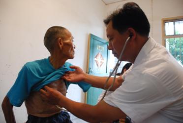 汽车在尘土飞扬的乡间公路上奔驰了20多分钟,停在绿色中掩映着的几幢不算高大的建筑前。一下车,医疗队马上展开了工作。简陋的办公室里,摆两张桌子拉几把椅子就成了义诊台。最先走进来的是一位瘦骨嶙峋的老大爷,他一直用手捂住左胸向义诊全队长描述自己的病痛,模糊不清的方言,却透露出一些欣慰和激动。全队长等等一边听老人们的讲述一边轻言细语地询问,“是那种像针刺一样的,一阵一阵的痛吗?”“您这个情况多久了啊?”。开完药后,全医生耐心细致地嘱咐,“这个药吃了有点反应,您不要担心。”“这药是一定要在饭后吃的,您可要记得啊。”时近中午,两个多小时的诊疗结束了。