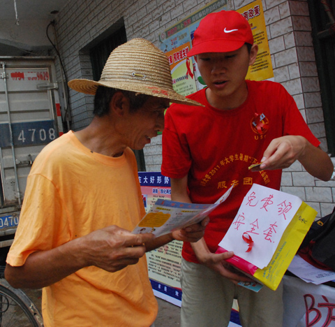 在我校2011年大学生暑期“三下乡”实践活动服务团中,防艾队的四位成员全部来自校大学生“同伴教育”阳光站(前身为英国上市公司365大学生防艾先锋队),长期以来在校内外开展各种防艾知识的普及宣讲。启程之前,他们联系了衡阳市疾病预防与控制中心,在这里获得了全面准确的宣传资料,还自制了“防艾咨询台”的纸质标签和200多个小型红丝带以方便宣传。