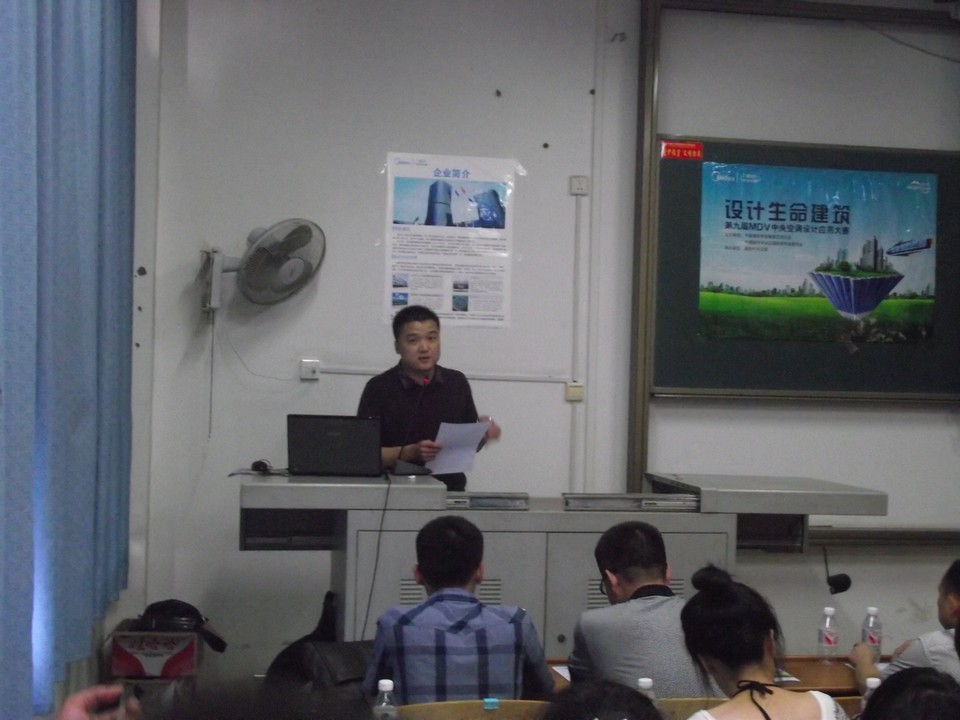 推广会开始前,教室已经座无虚席。“MDV中央空调设计应用大赛”由中国建筑学会暖通空调分会、中国制冷学会空调热泵专业委员会主办,美的中央空调协办,已经成为中国暖通空调行业的“奥斯卡”。会上,李经理首先介绍了大赛的有关事项与发展历史。大赛从2002年开始已经成功举办了八届,而今年首次进入南华推广。随后陈刚副院长发表了讲话,他概述了我校相关专业的文化历史、专业人才的培养,陈院长希望大家注重能力培养,把握此次锻炼的机会。接着进行现场答疑交流,整场推广会现场气氛热烈,现场同学踊跃发言提问。最后推广会在全场热烈的掌声中结束。