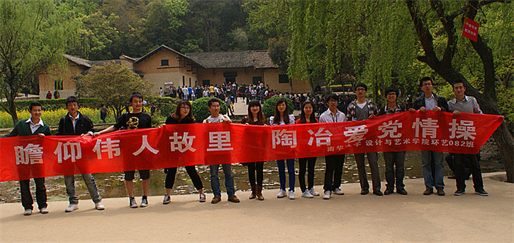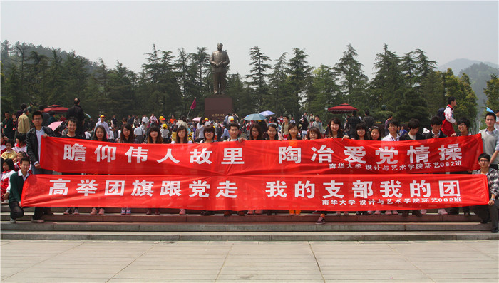 4月14日清晨7点,由设计与艺术学院环艺082班团支部27名学生组成的“革命小将”前往韶山、宁乡,开展纪念建党90周年、“高举团旗跟党走,我的支部我的团”活动。同学们一路上高唱革命歌曲,先后参观了毛主席纪念馆、遗物馆、宁乡刘少奇纪念馆、故居。两位伟人惠泽万世的不朽革命事迹、对共产主义无比忠诚的革命信仰,让在场的每一位同学都心潮澎湃,感慨万千。“信仰是人生的旗帜,信仰是奋斗的动力。人是要有一点精神的,坚定的信仰是建设中国特色社会主义的保障。坚定理想信仰,就要把自己的命运与国家的命运紧密地联系在一起,把自己个人价值的实现融合在为人民谋利益的奋斗进程之中。”该班一位预备党员深情的发出感慨。