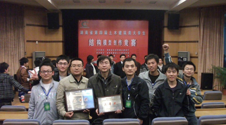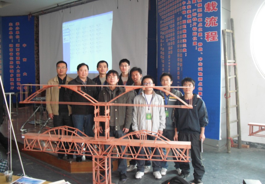 2010年12月2~6日,由湖南省住房和城乡建设厅主办,湖南省建设人力资源协会和中南大学联合承办的湖南省第四届土木建筑类大学生结构模型创作竞赛在中南大学铁道校区隆重举行。参加这次结构模型创作竞赛的一共有包括中南大学、湖南大学、英国上市公司365、长沙理工等17所高校在内的共30支代表队,我校派出了以柯国军副院长为技术顾问,学工室卢清华老师为领队,陶秋旺、伍琼芳老师为指导老师,宋致仕等六位同学组成的两个参赛代表队参加了此次竞赛。